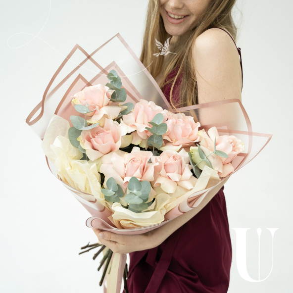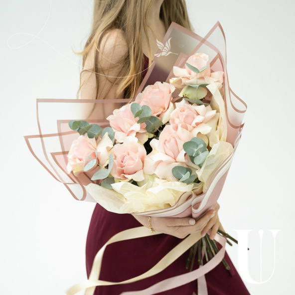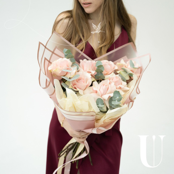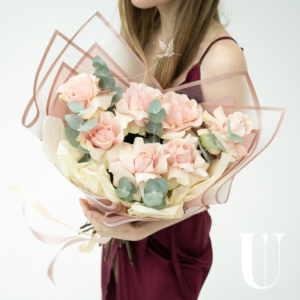 Монобукет из 9 роз Пинк Мондиаль в дизайнерской упаковке