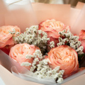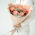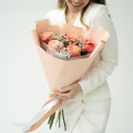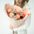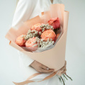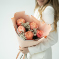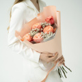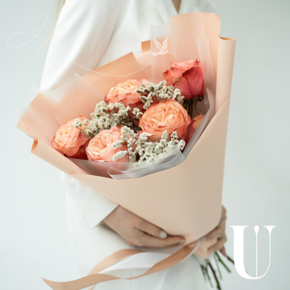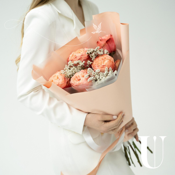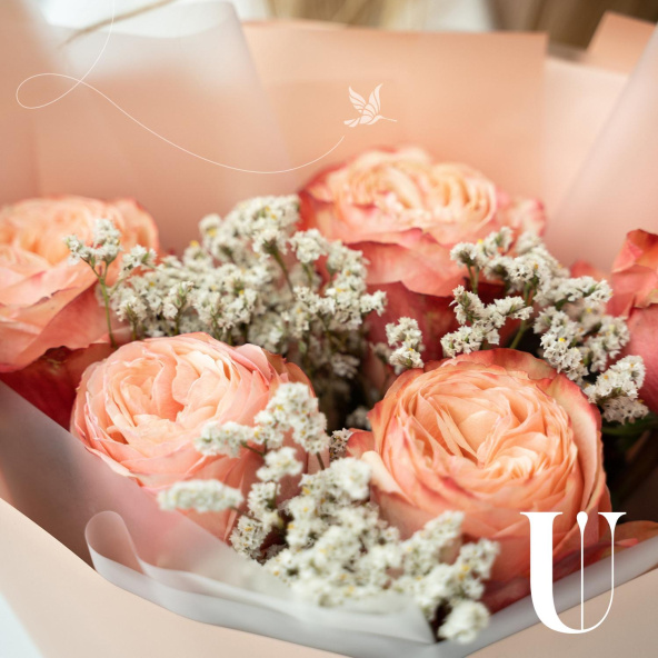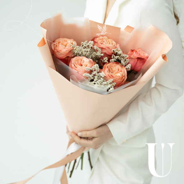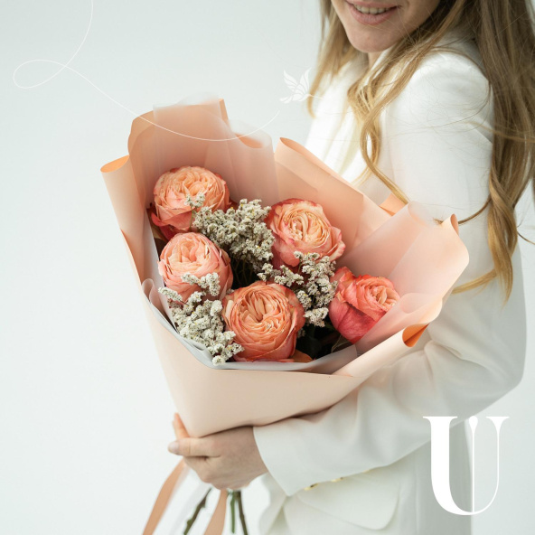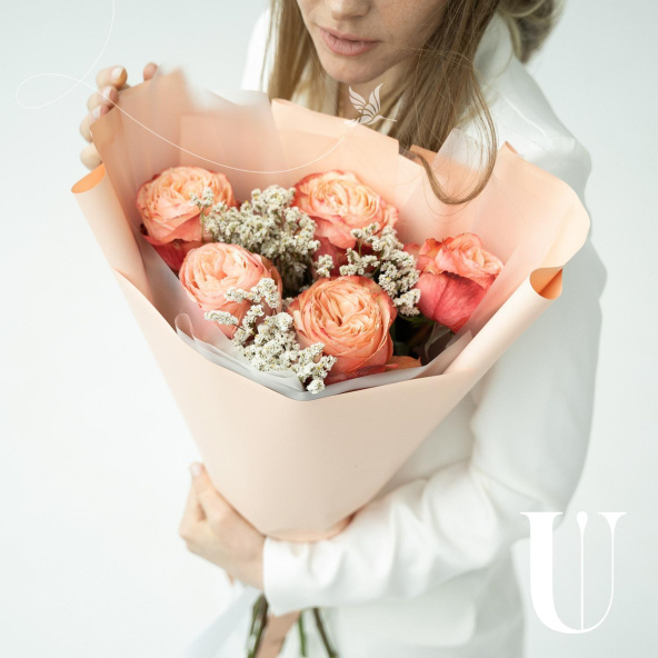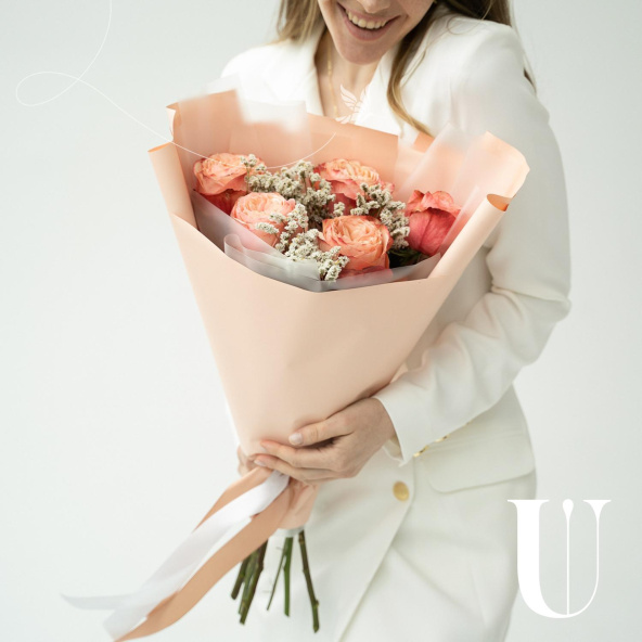 Букет из 7 персиковых роз сорта Шиммер в дизайнерской упаковке