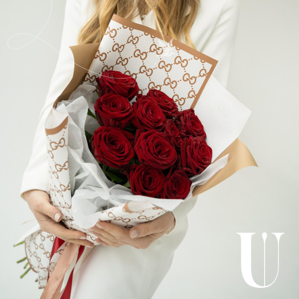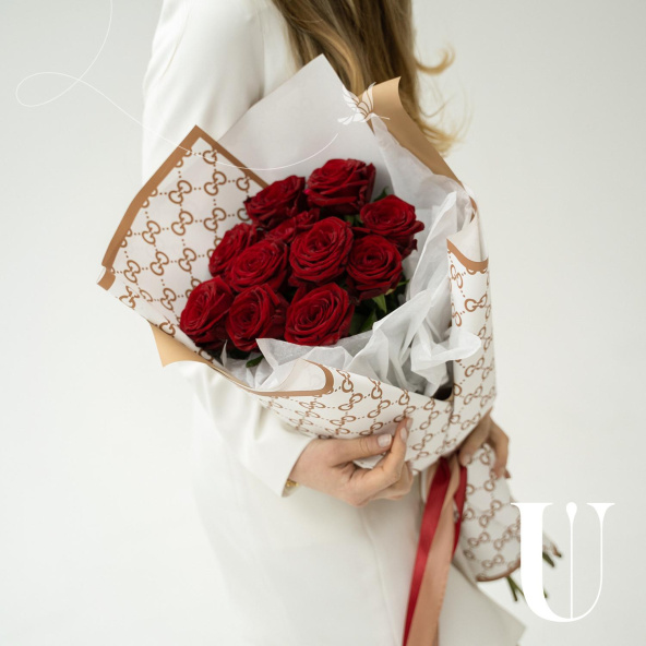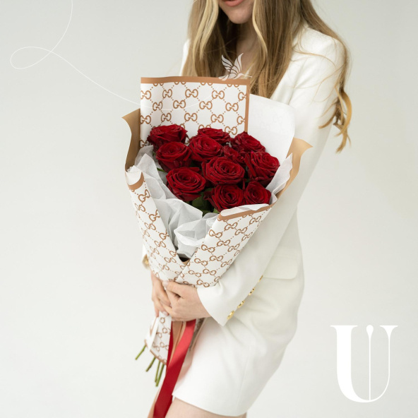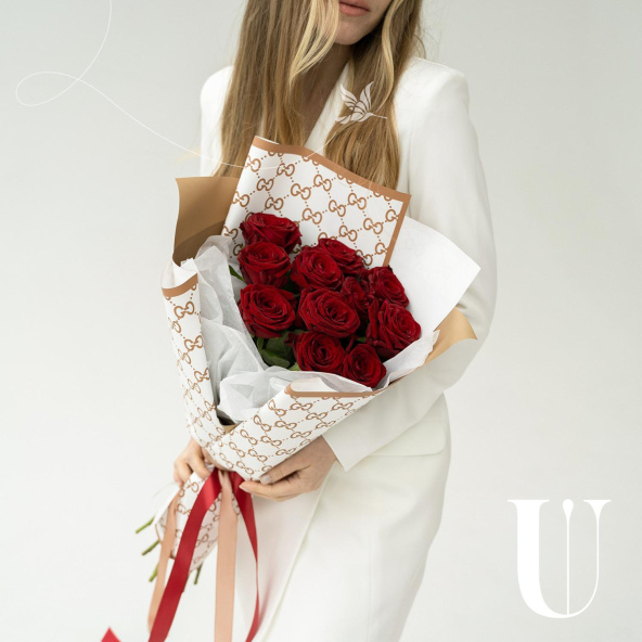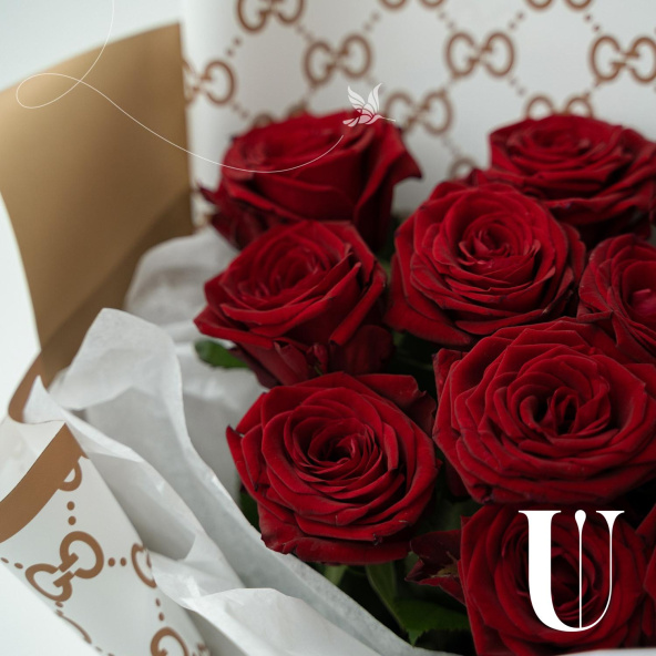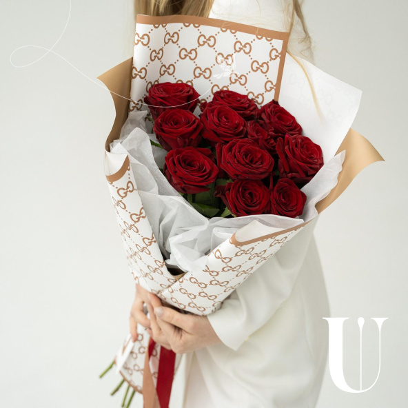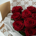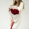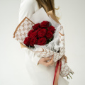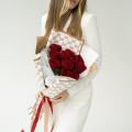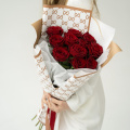 Монобукет из 9 роз сорта Ред Наоми в упаковке