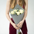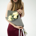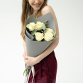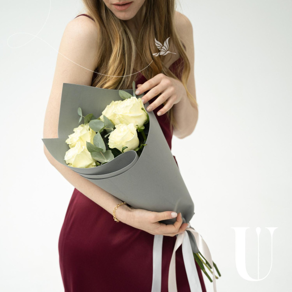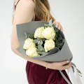 Монобукет из 5 роз сорта Вайт Охара и лимониума в упаковке