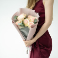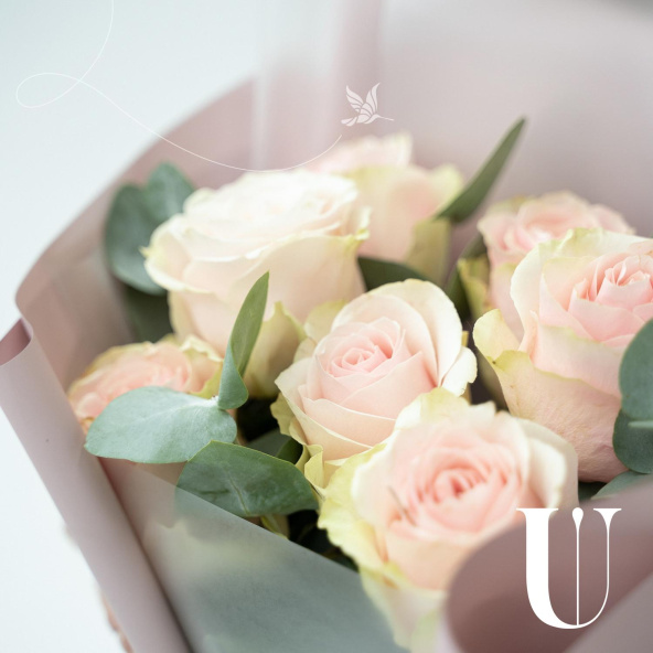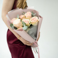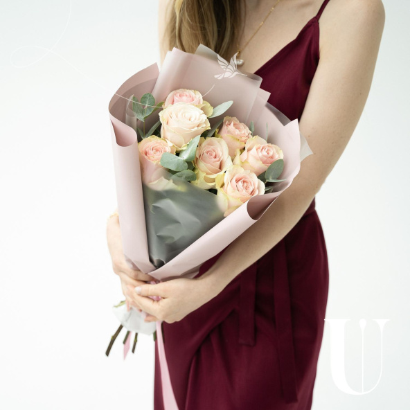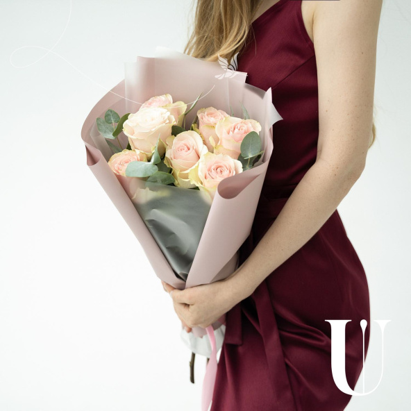 Монобукет из 7 роз сорта Капучино и эвкалипта в дизайнерской упаковке
