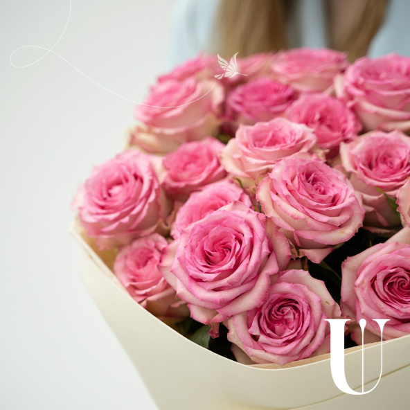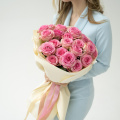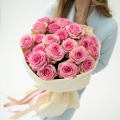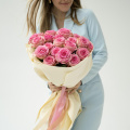 Монобукет из 15 розовых пионовидных роз в дизайнерской упаковке