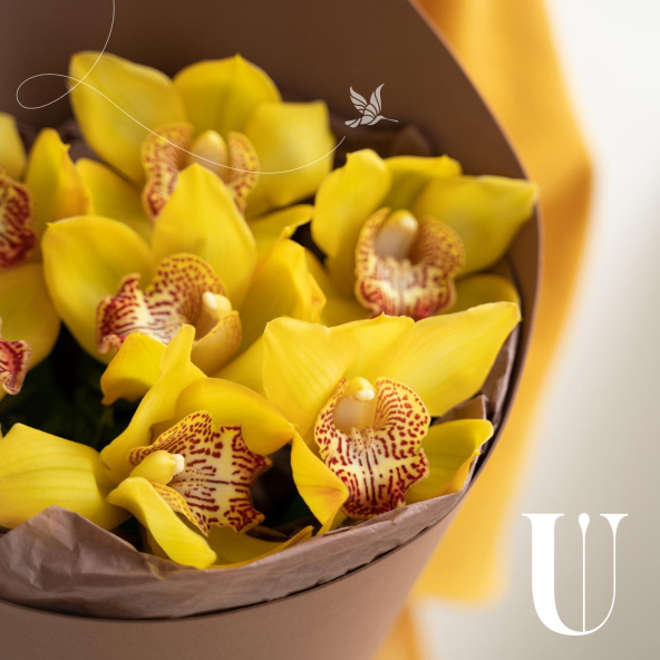 Монобукет из 5 бело-золотистых роз сорта Кэндлайт в упаковке