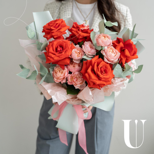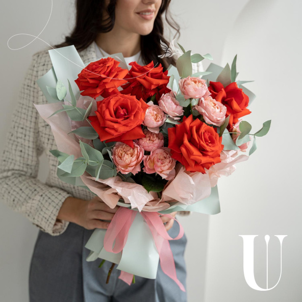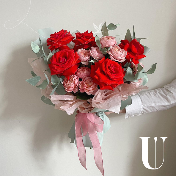 Монобукет из розовых кустовых пионовидных роз в дизайнерской упаковке
