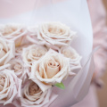 Букет из ажурных французских розовых роз в упаковке из матовой пленки и бумаги тишью
