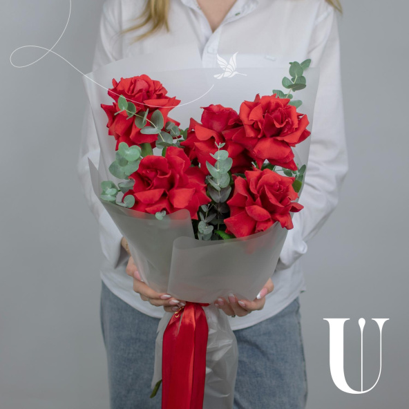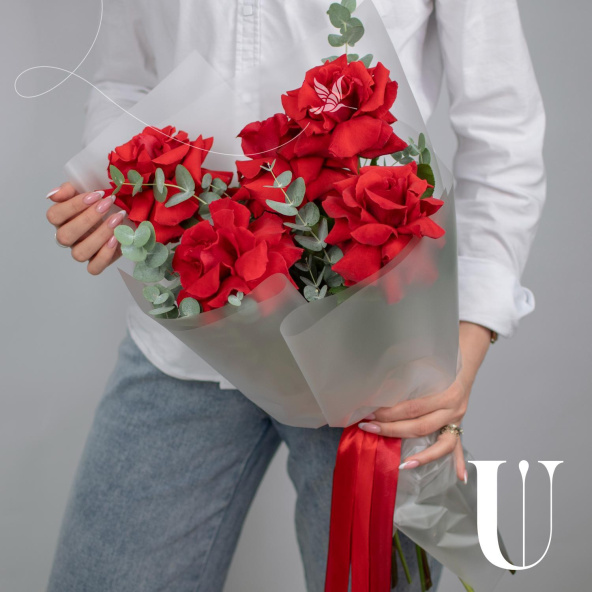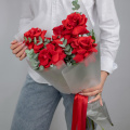 Монобукет из 7 красных роз в дизайнерской упаковке
