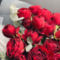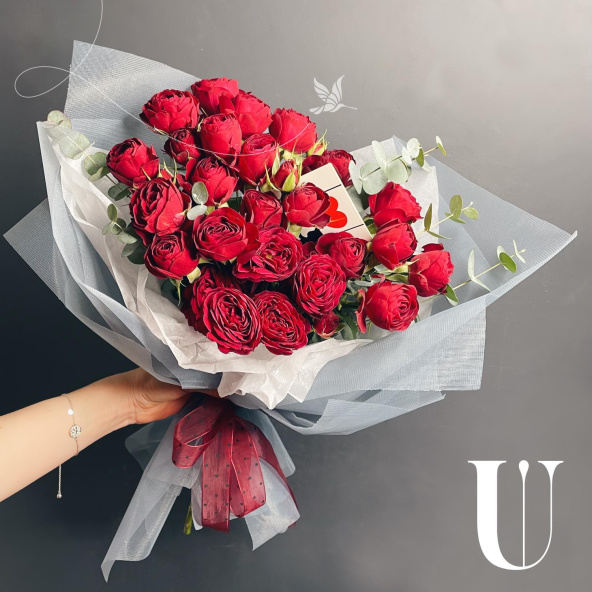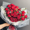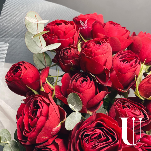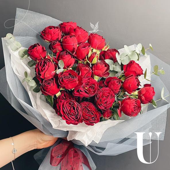 Монобукет из кустовых пионовидных роз сорта Бомбастик в дизайнерской упаковке