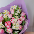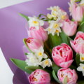 Букет из пионовидных роз Мандарнин Экспрешн и кустовых роз Джульетта в упаковке