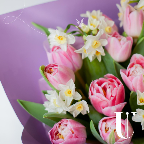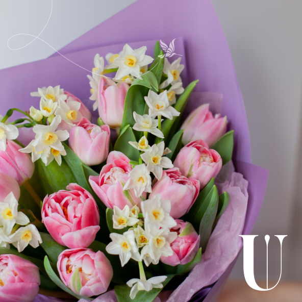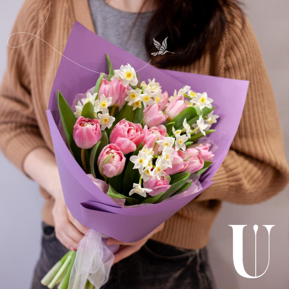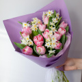 Монобукет из роз Готча и роз Пинк Мондиаль в дизайнерской упаковке