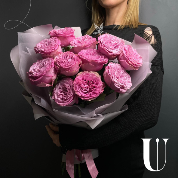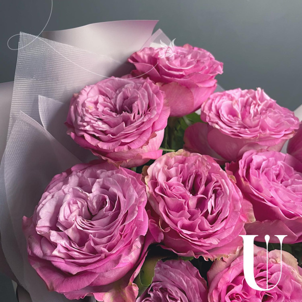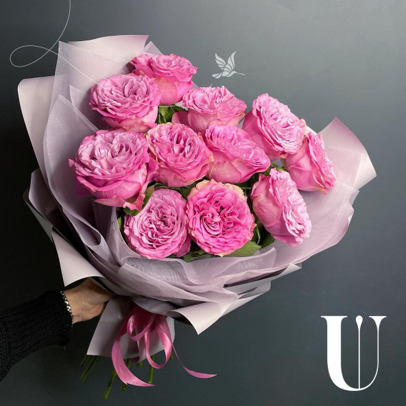 Монобукет из 9 роз Пинк Мондиаль в дизайнерской упаковке
