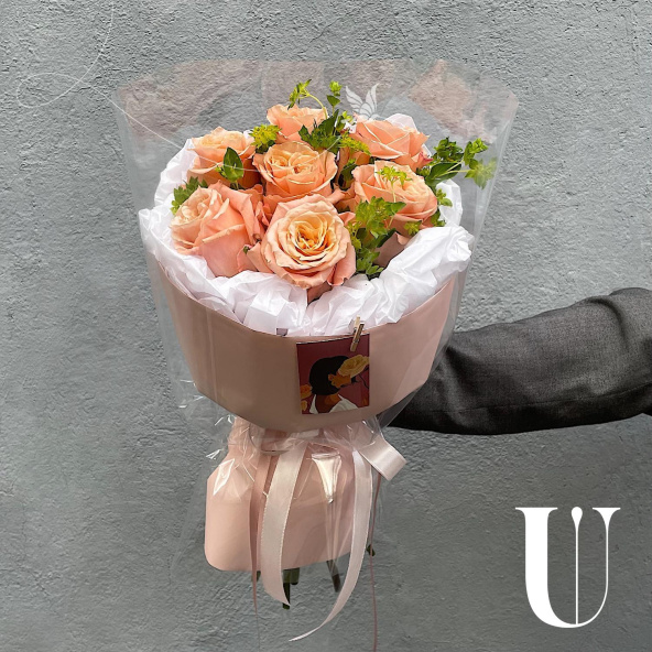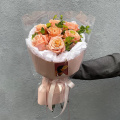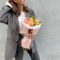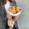 Монобукет из пионовидных роз Кахала и лимониума в нежной упаковке