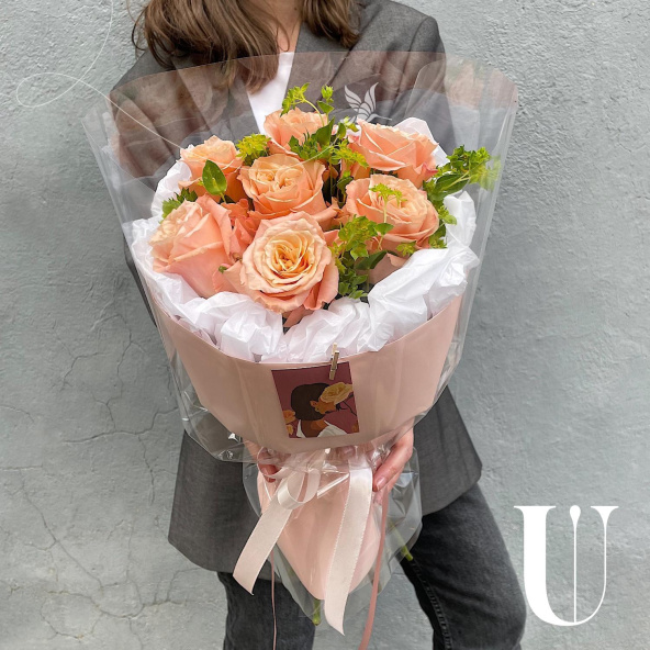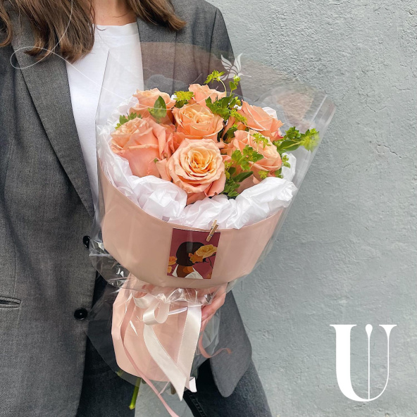 Монобукет из 5 роз сорта Мондиаль в дизайнерской упаковке