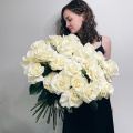 Монобукет из розовых и белых пионовидных роз в дизайнерской упаковке