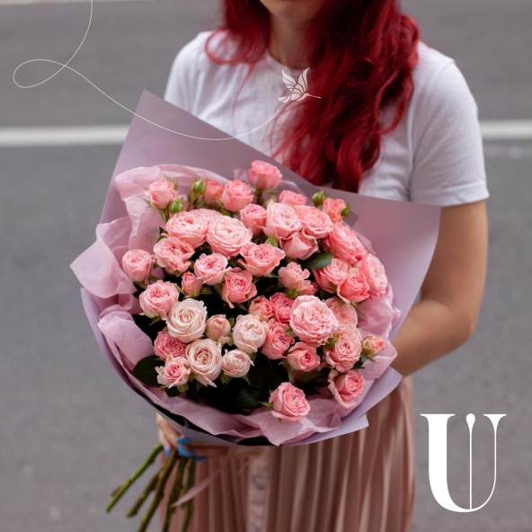 Монобукет из розовых кустовых пионовидных роз в дизайнерской упаковке