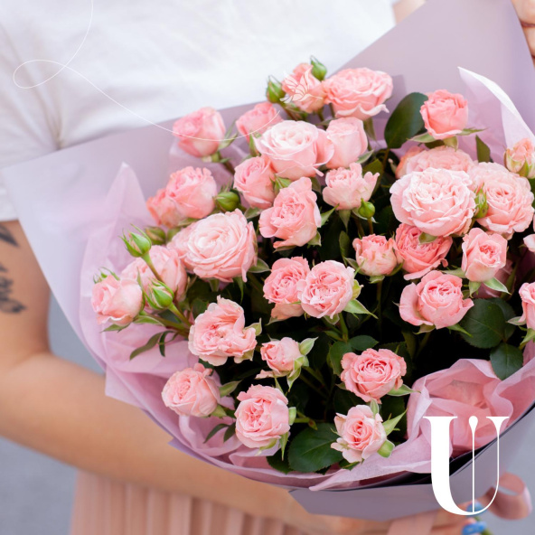 Монобукет из кустовых пионовидных роз сорта Бомбастик в дизайнерской упаковке