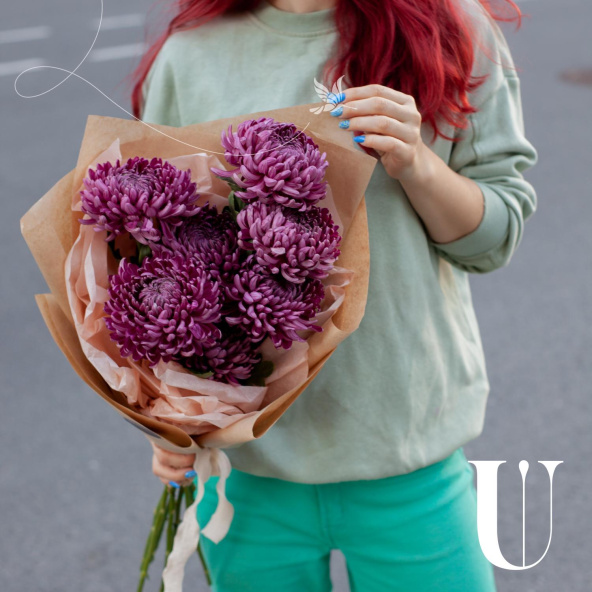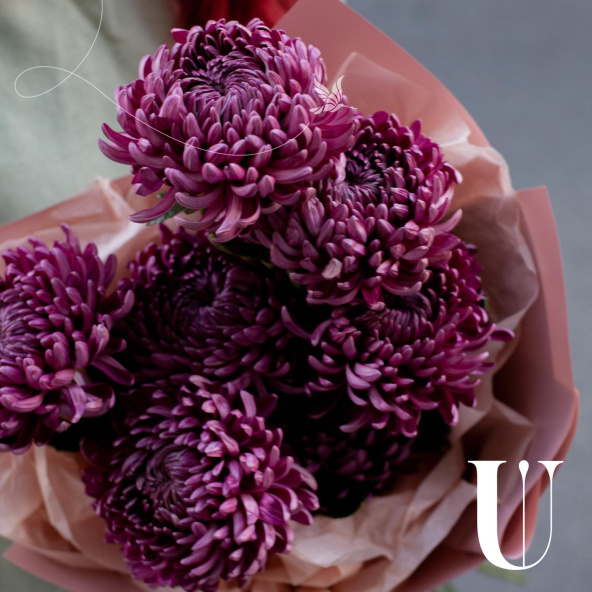Монобукет из 5 белых хризантем сорта Виена в белой упаковке