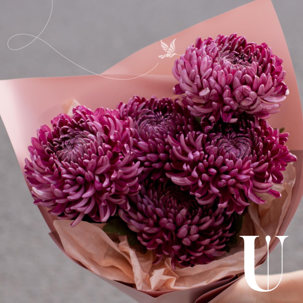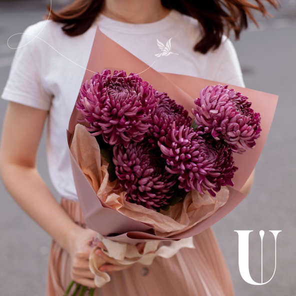 Монобукет из 5 белых хризантем сорта Виена в белой упаковке