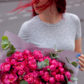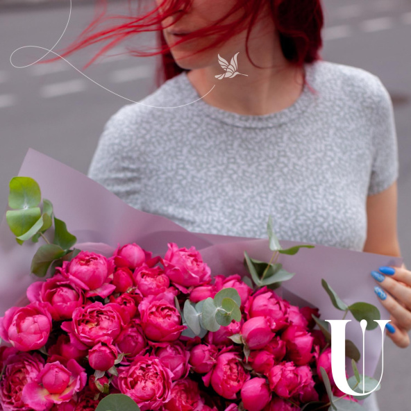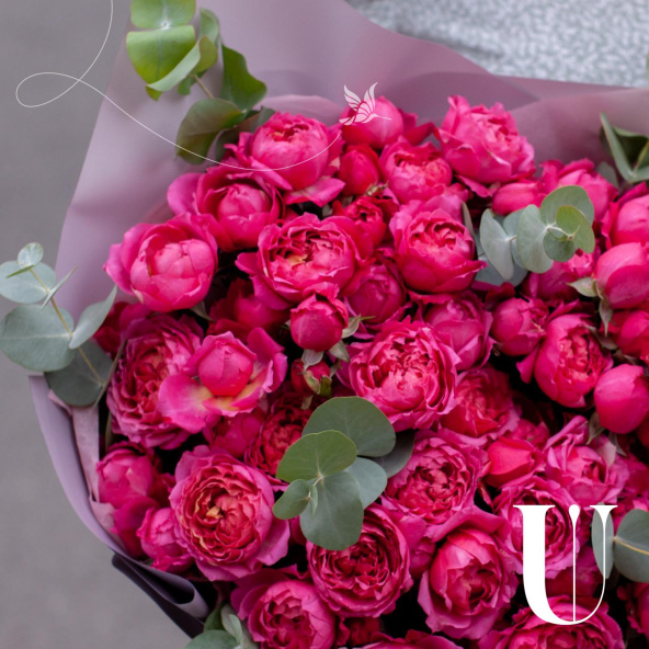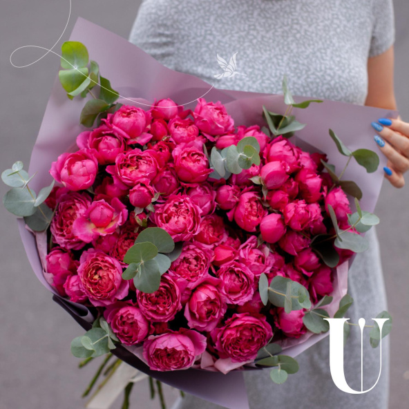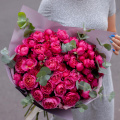 Стильный монобукет из 25 пионовидных роз Кахала в упаковке