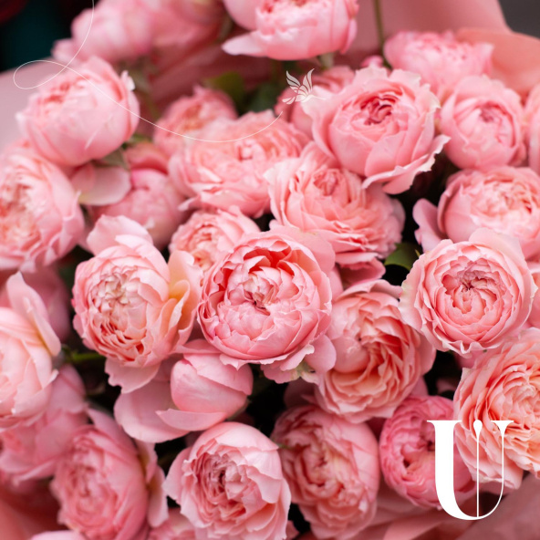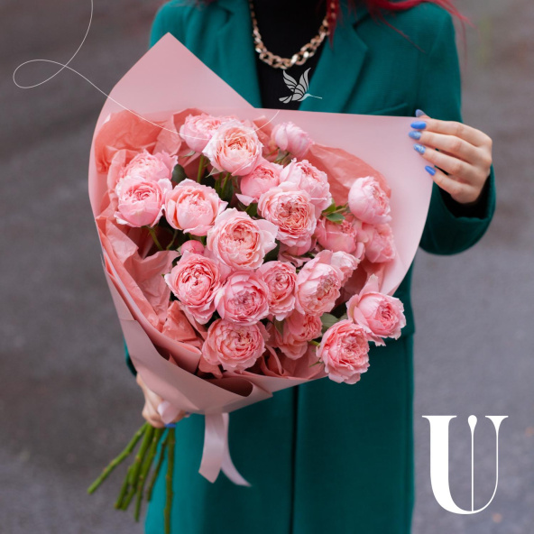Букет из кустовых пионовидных роз сорта Джульетта в дизайнерской упаковке