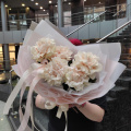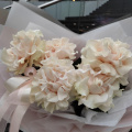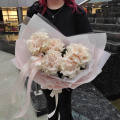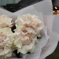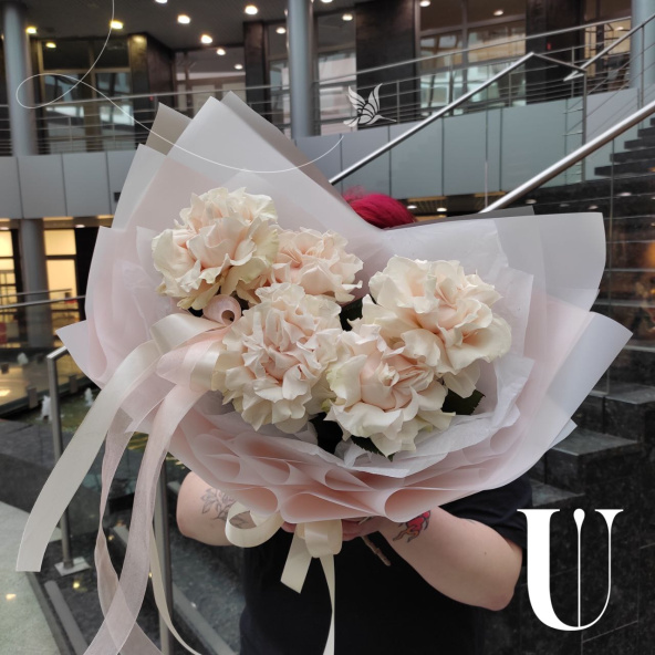 Монобукет из кустовых пионовидных роз сорта Бомбастик в дизайнерской упаковке