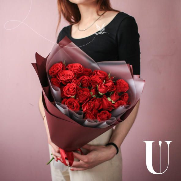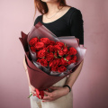 Сочный букет с французскими розами и красными альстромериями в упаковке
