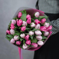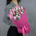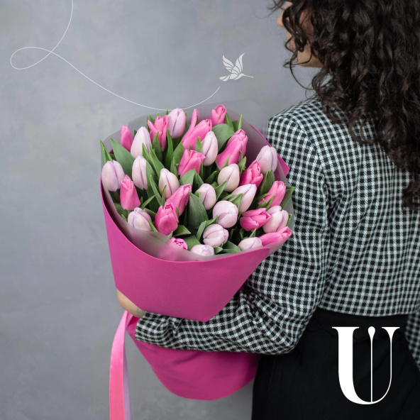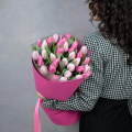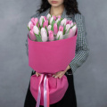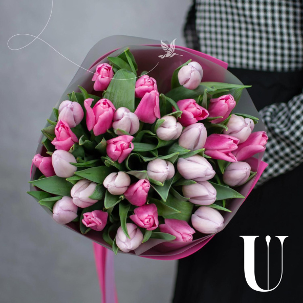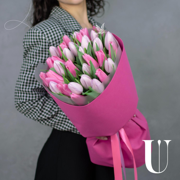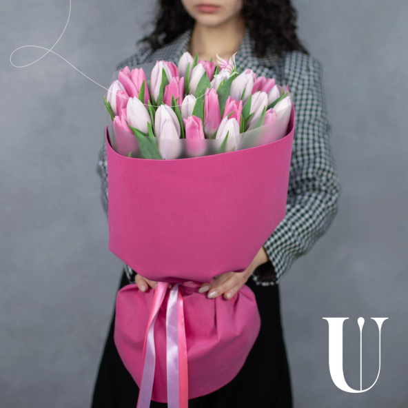 Нежный букет из 31 розового тюльпана в фигурной упаковке.
