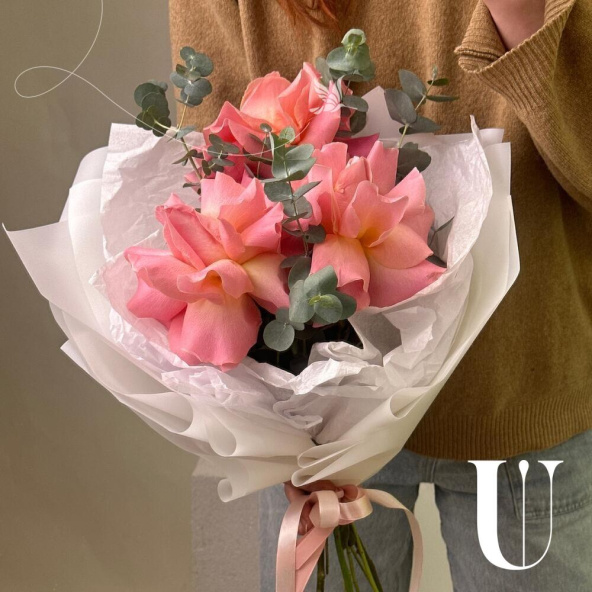 Монобукет из 7 роз сорта Капучино и эвкалипта в дизайнерской упаковке
