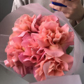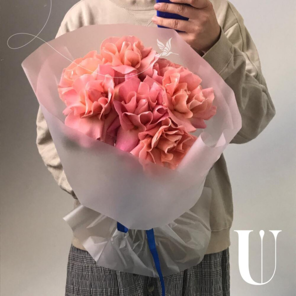 Монобукет из кустовых пионовидных роз сорта Бомбастик в дизайнерской упаковке