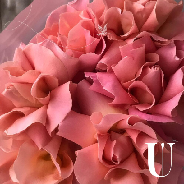 Букет из 7 персиковых роз сорта Шиммер в дизайнерской упаковке