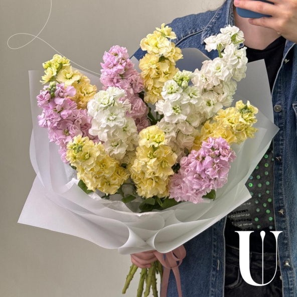 Монобукет из розовых кустовых пионовидных роз в дизайнерской упаковке