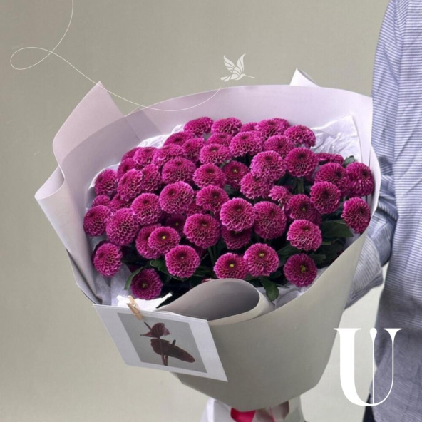 Монобукет из белых кустовых хризантем и лаванды в упаковке