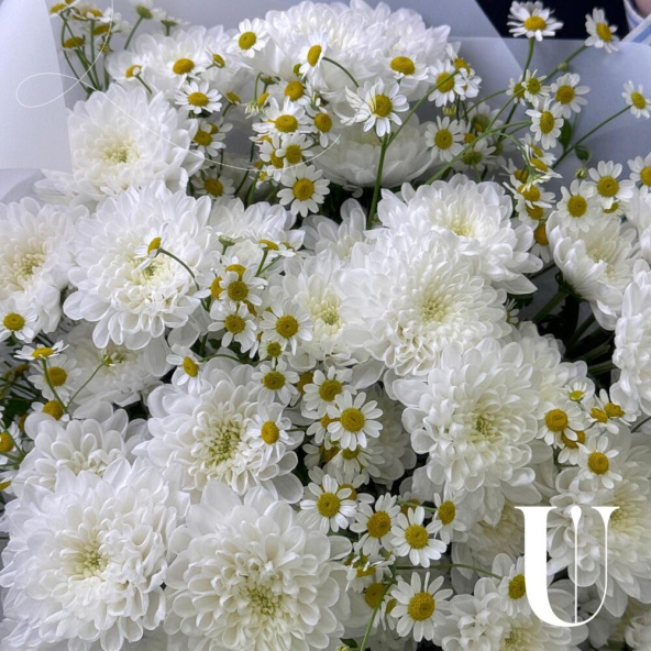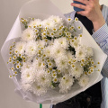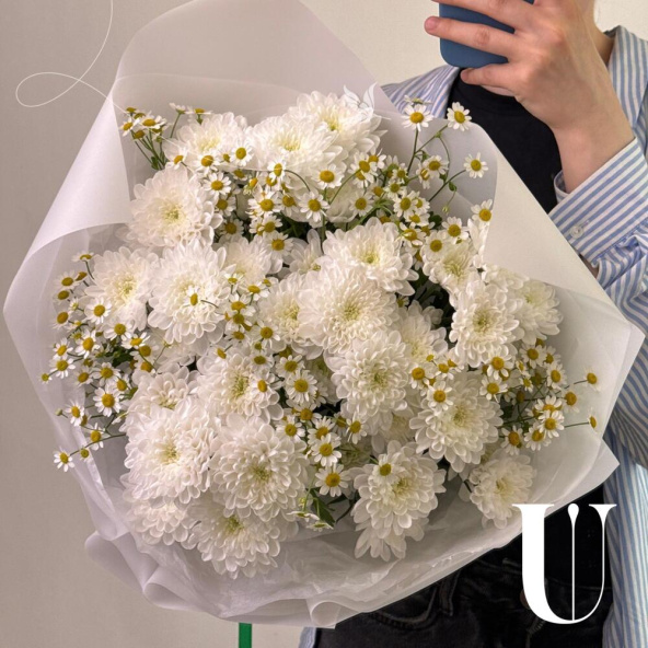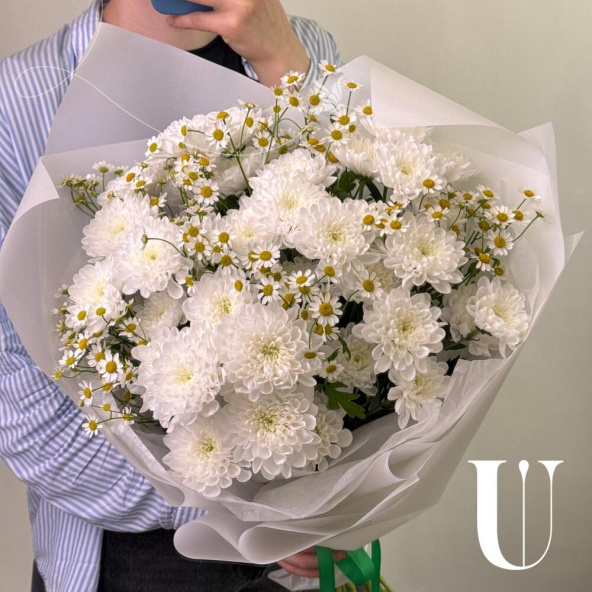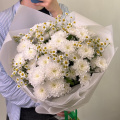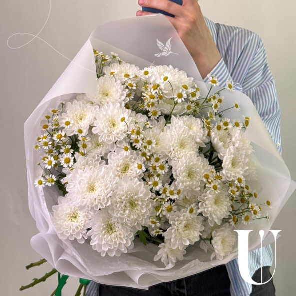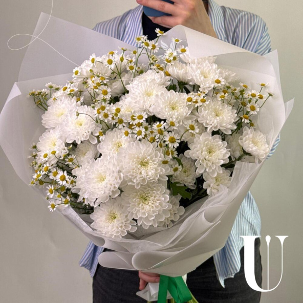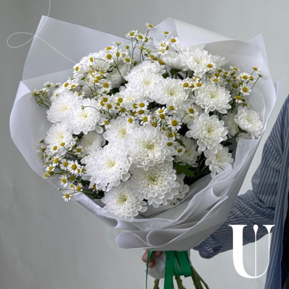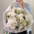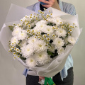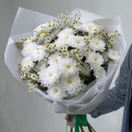 Букет из белых кустовых хризантем в белой упаковке