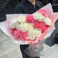 Букет из розовых гортензий и белых тюльпанов в розовой упаковке