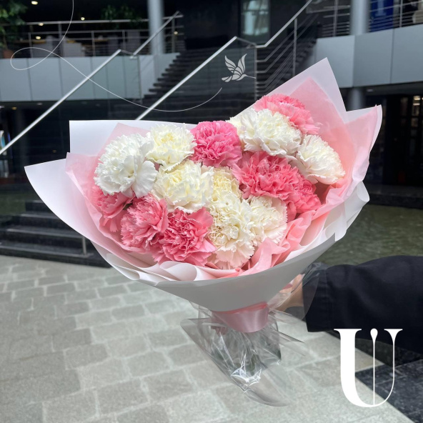 Дуэт гвоздик в композиции олицетворяет элегантность и гармонию. Нежные оттенки лепестков создают изысканное сочетание, в котором каждый цветок дополняет другой, создавая общий эффект изящества и красоты.