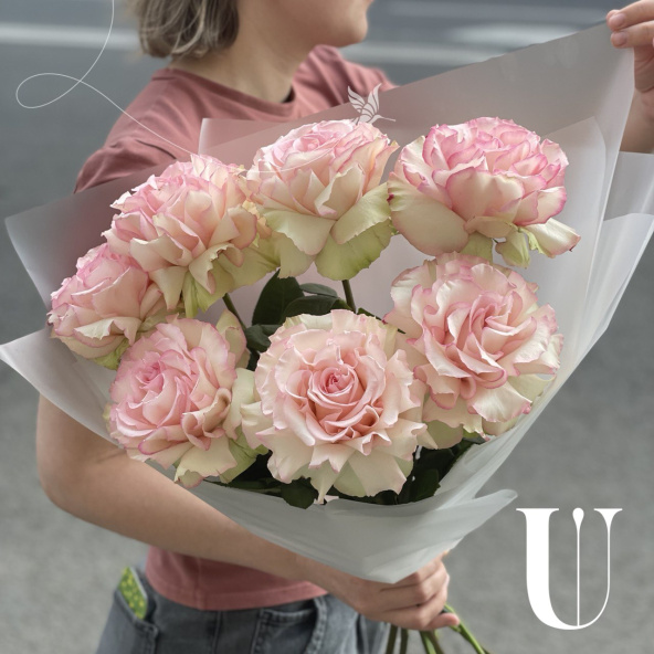 Классический букет из 7 роз сорта Пинк Охара в дизайнерской упаковке