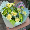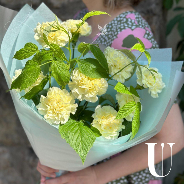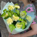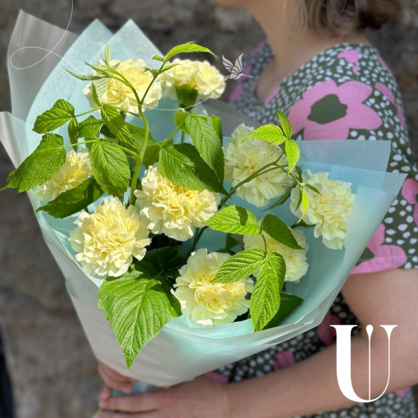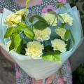 Монобукет из 7 розовых диантусов и эвкалипта в упаковке