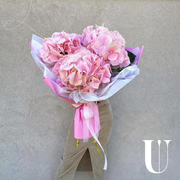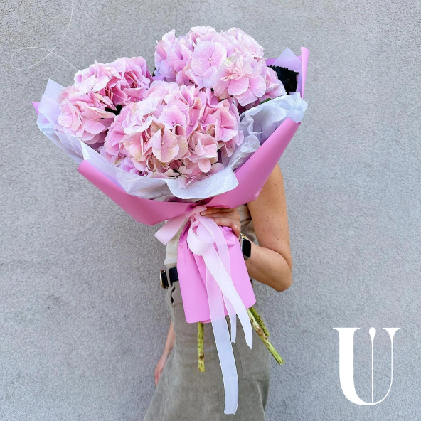 Монобукет из трех шапок гортензии в крафтовой упаковке