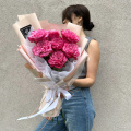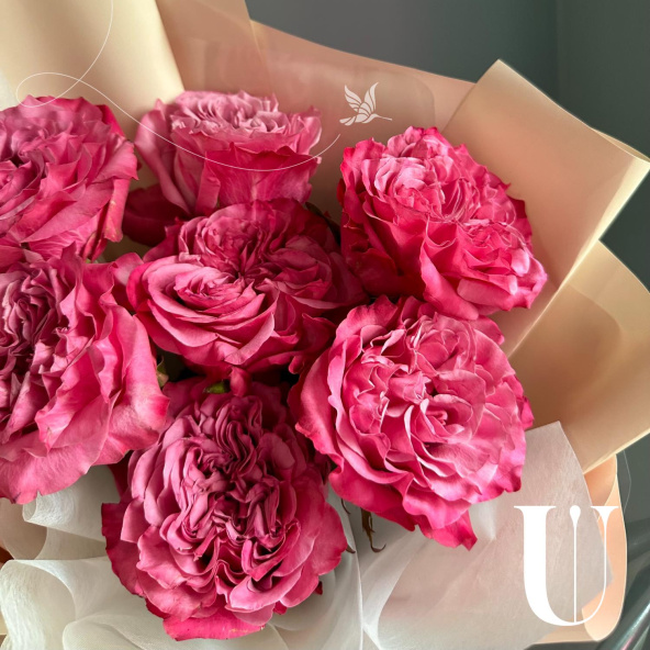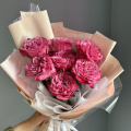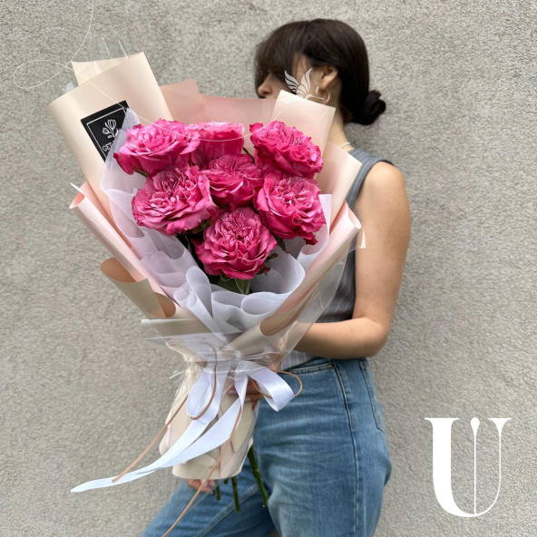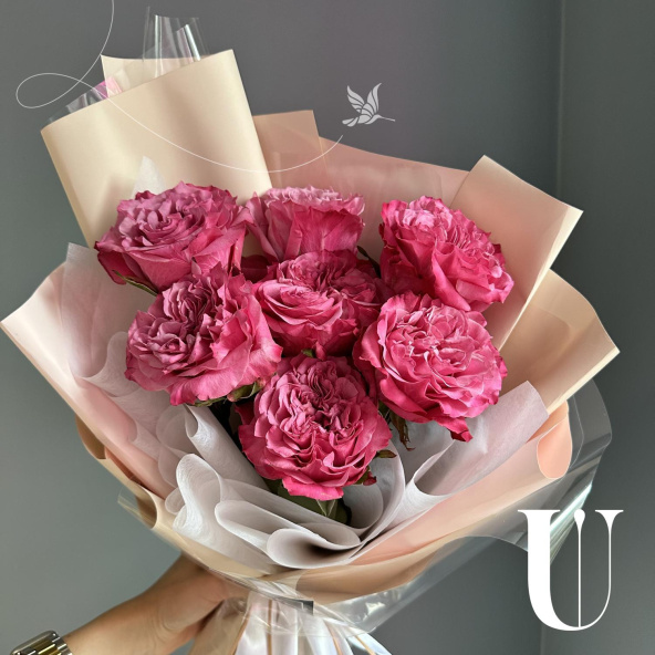 Букет из роз Пинк Охара и малиновых роз в дизайнерской упаковке