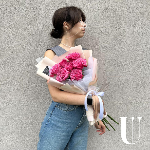 Монобукет из 7 роз сорта Пинк Флойд с атласной лентой