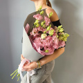 Букет из розовых гортензий и белых тюльпанов в розовой упаковке