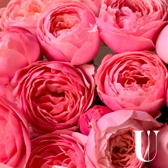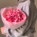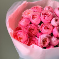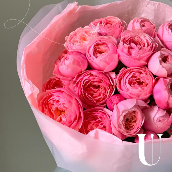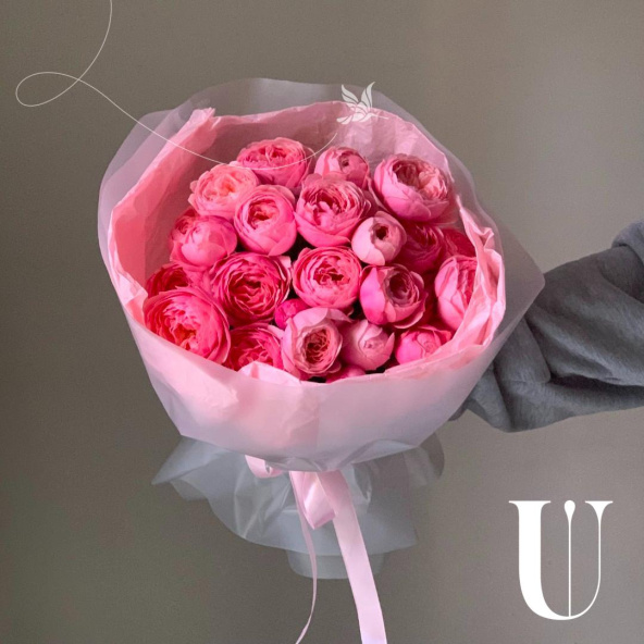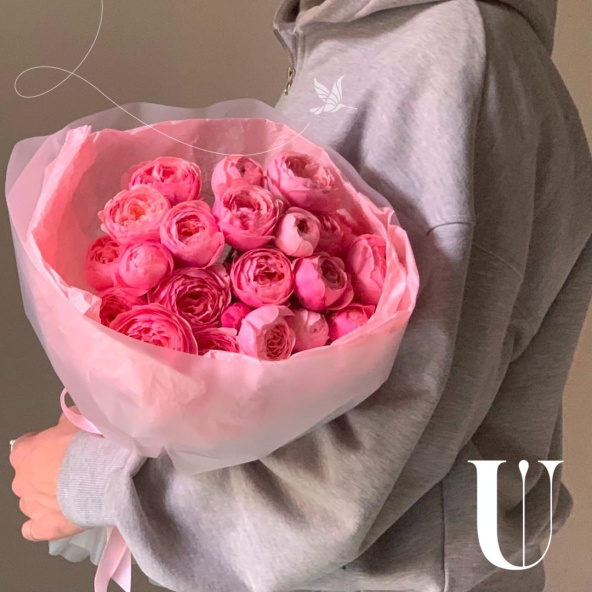 Стильный букет из пионвидных розовых роз в дизайнерской упаковке