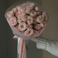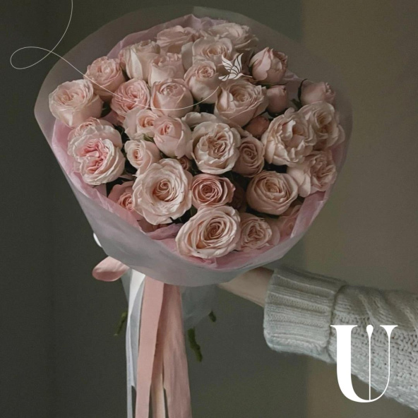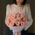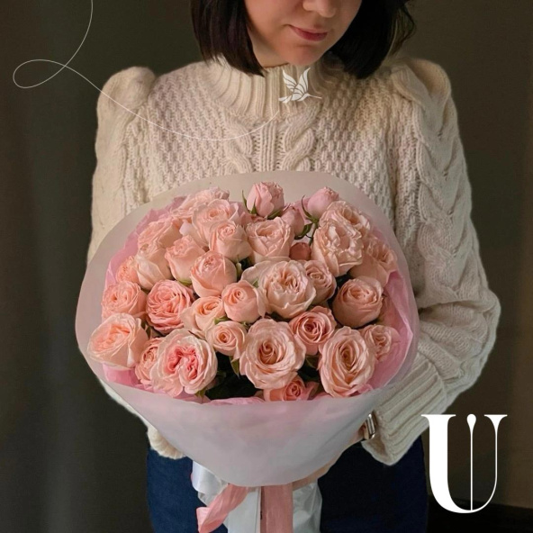 Монобукет из розовых кустовых пионовидных роз в дизайнерской упаковке