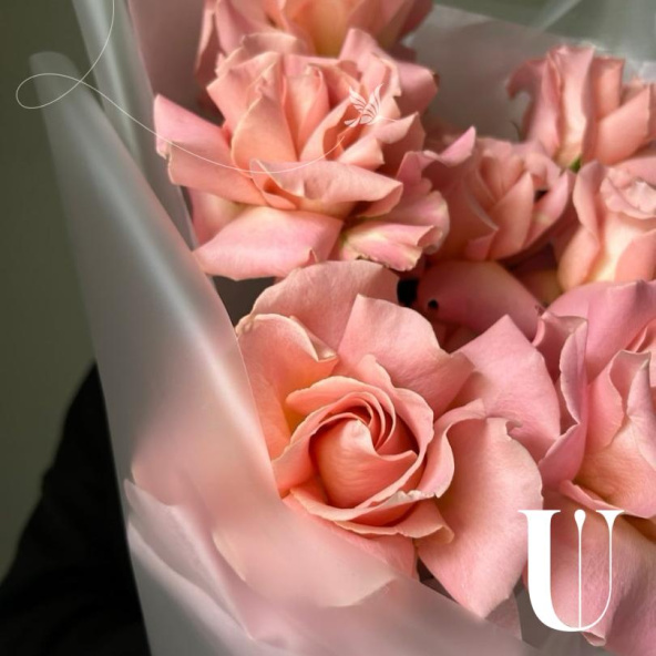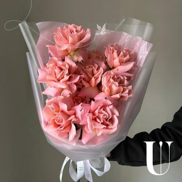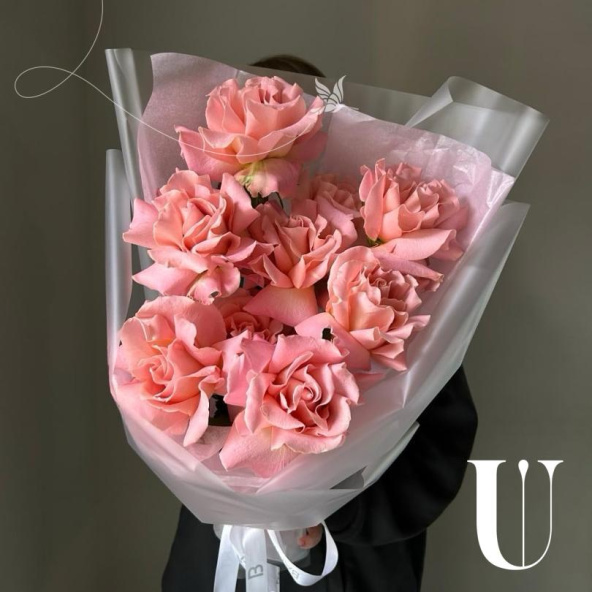 Монобукет из 9 роз Пинк Мондиаль в дизайнерской упаковке