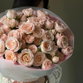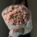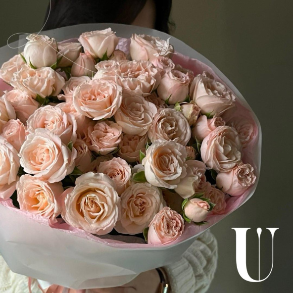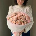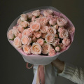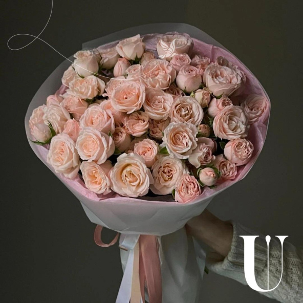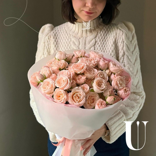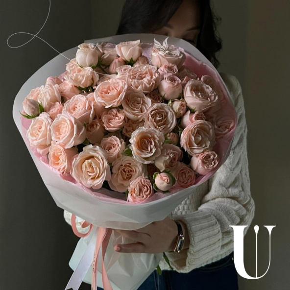 Монобукет из розовых и белых пионовидных роз в дизайнерской упаковке