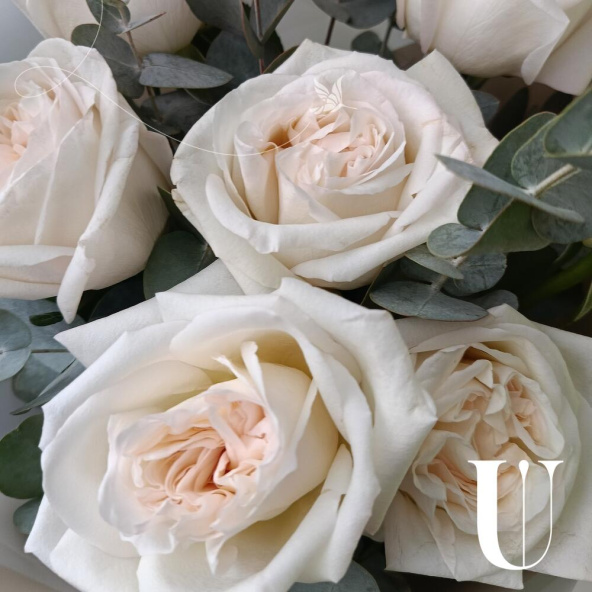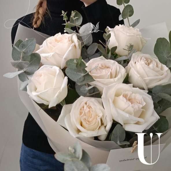 Стильный белый букет из роз Вайт Охара в дизайнерской упаковке