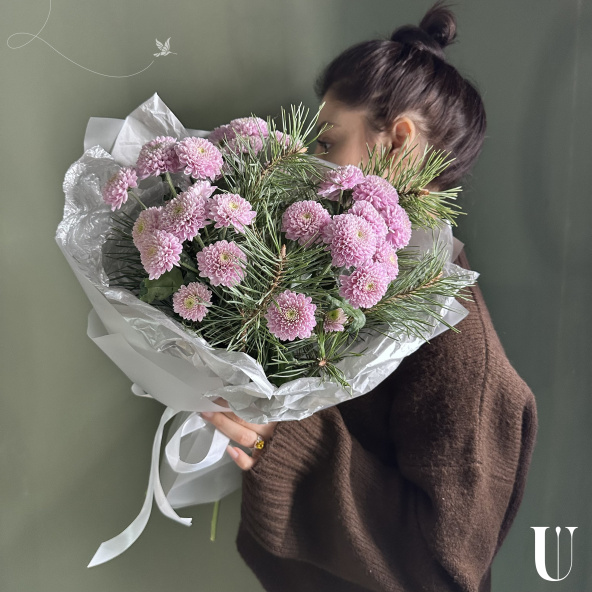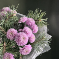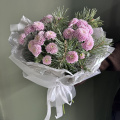 Монобукет из 7 розовых диантусов и эвкалипта в упаковке