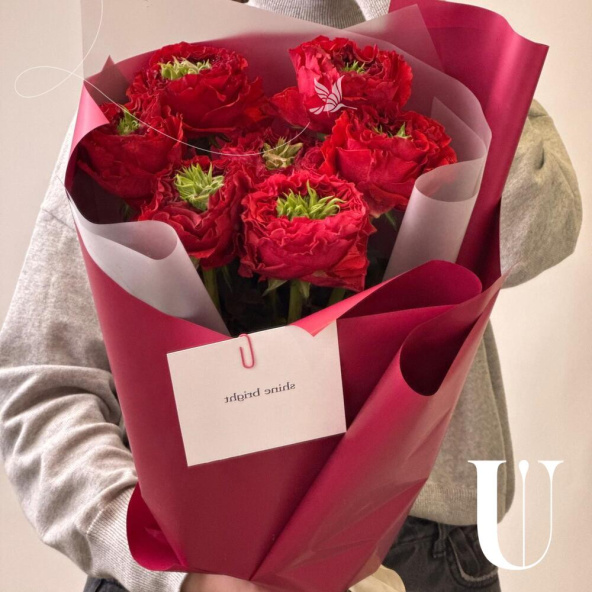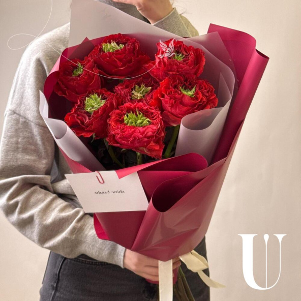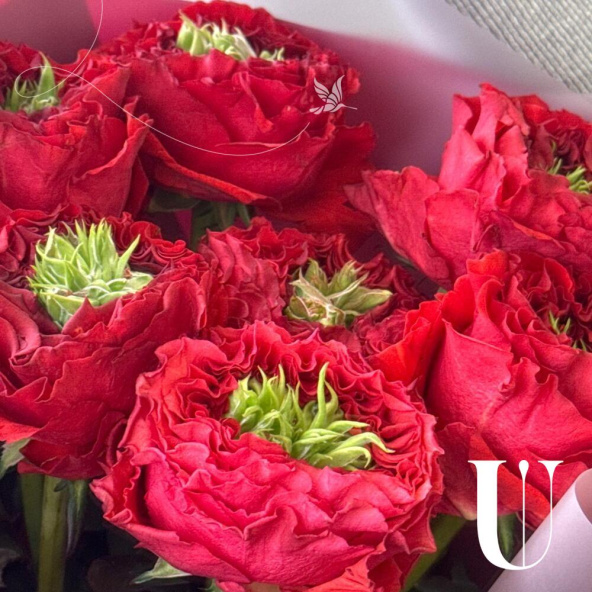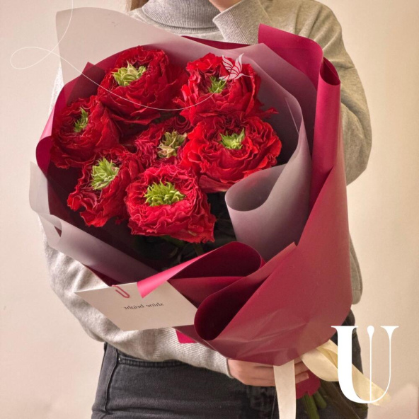 Букет из кустовых пионовидных роз сорта Джульетта в дизайнерской упаковке
