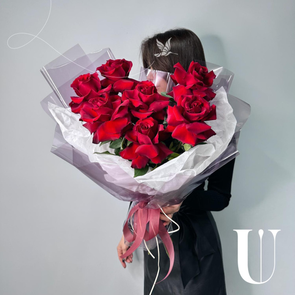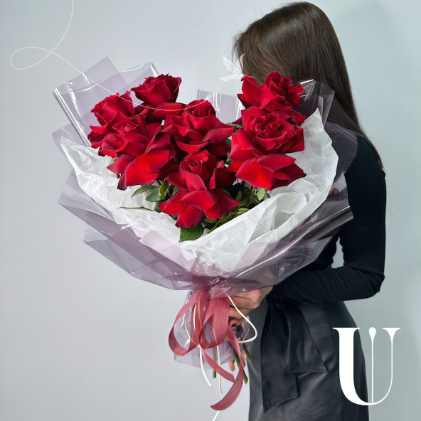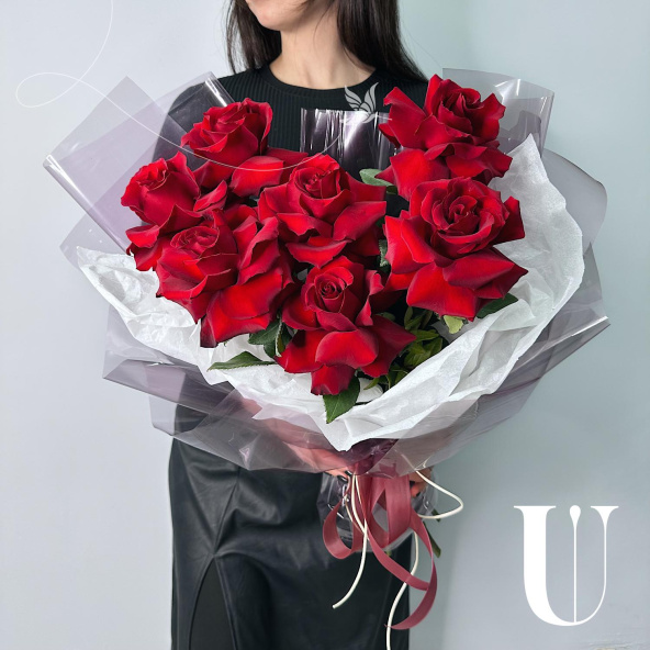 Монобукет из 9 роз сорта Мондиаль в матовой пленке