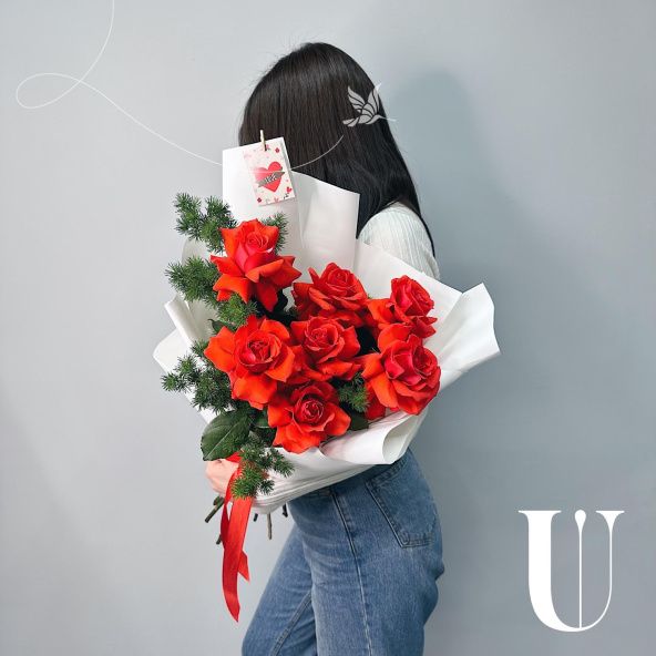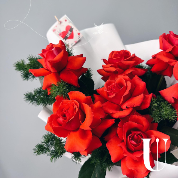 Монобукет из 9 красных роз в белой упаковке