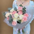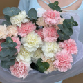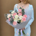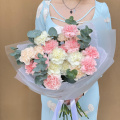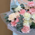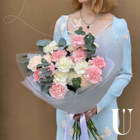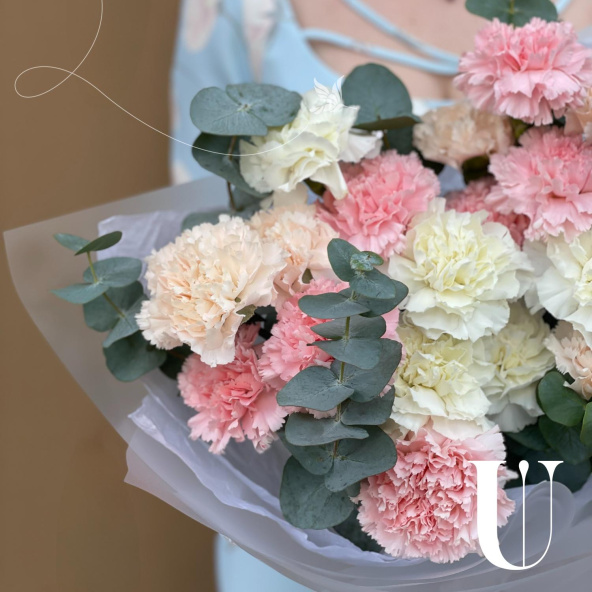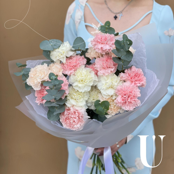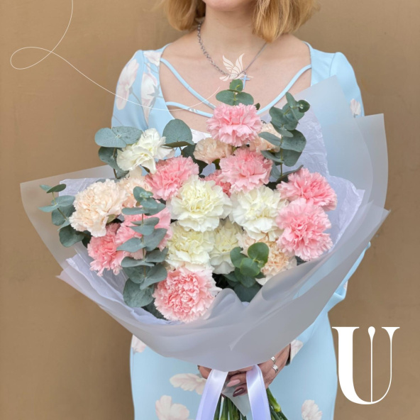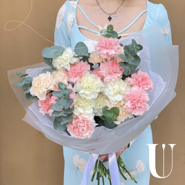 Монобукет из белых, персиковых и розовых диантусов (гвоздик), дополненный свежими веточками эвкалипта, представляет собой нежное и элегантное сочетание цветов.